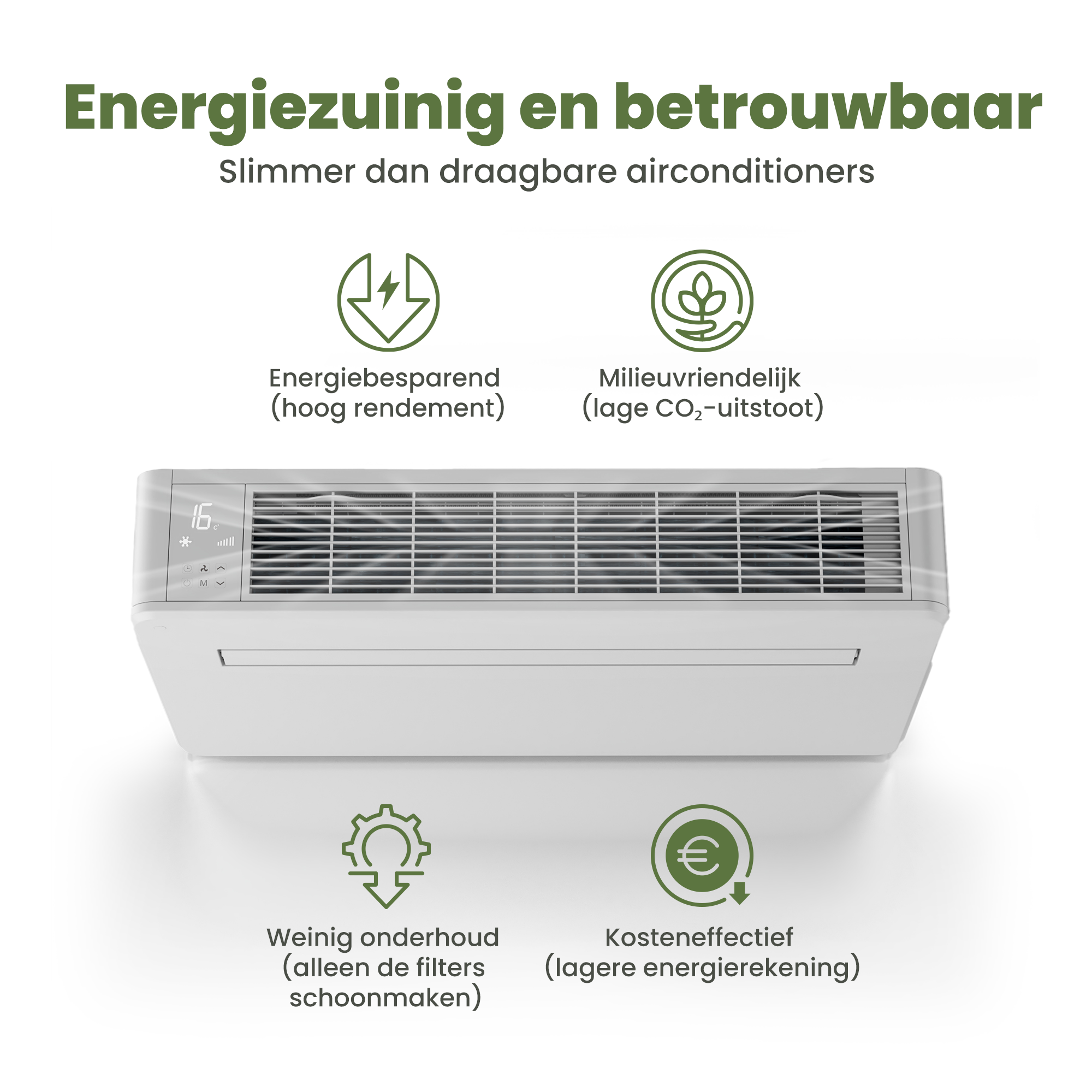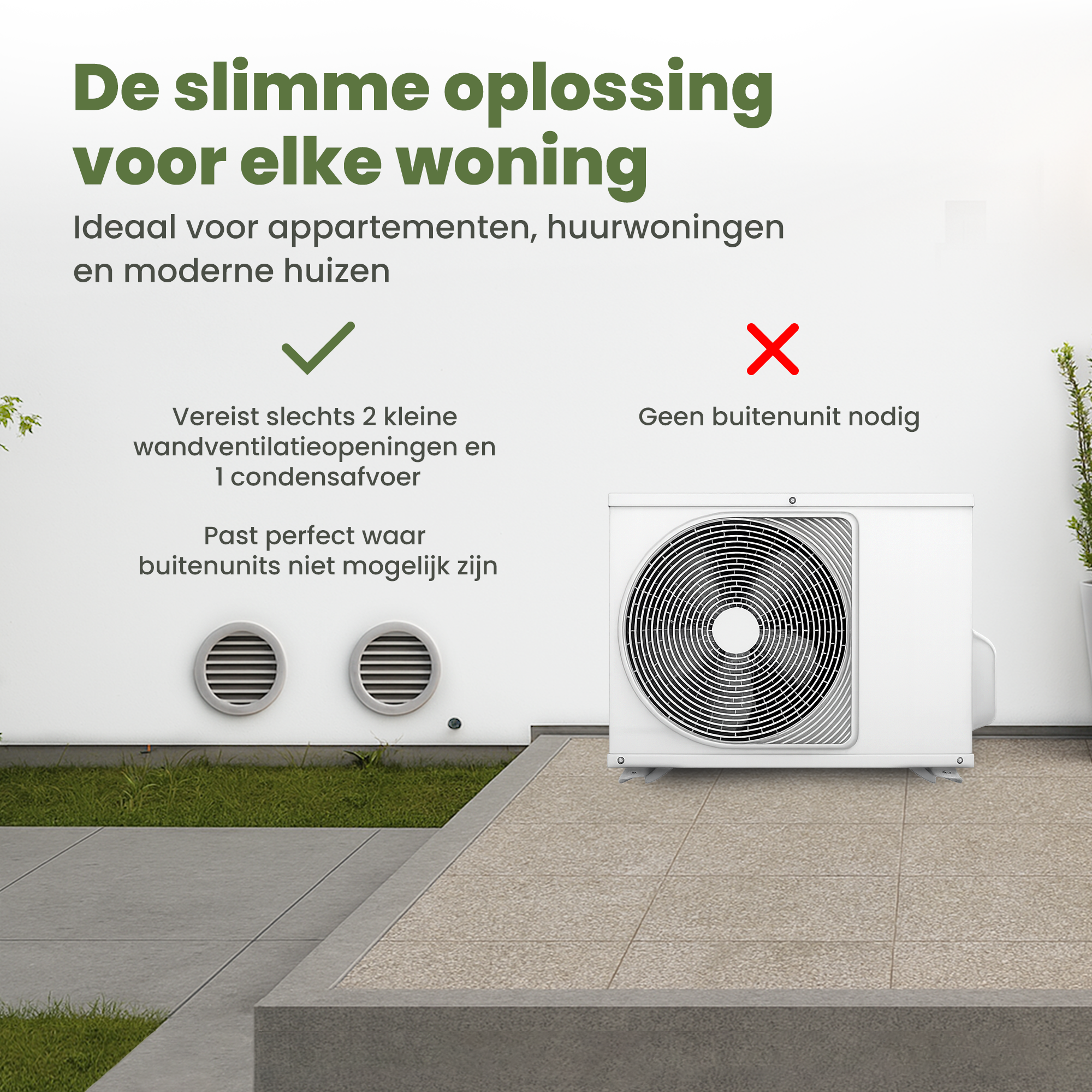 - Installatie: werkt met twee compacte muurdoorvoeren van Ø18 cm. Hierdoor blijft de gevel netjes en is de installatie veel eenvoudiger dan bij traditionele split airco’s.