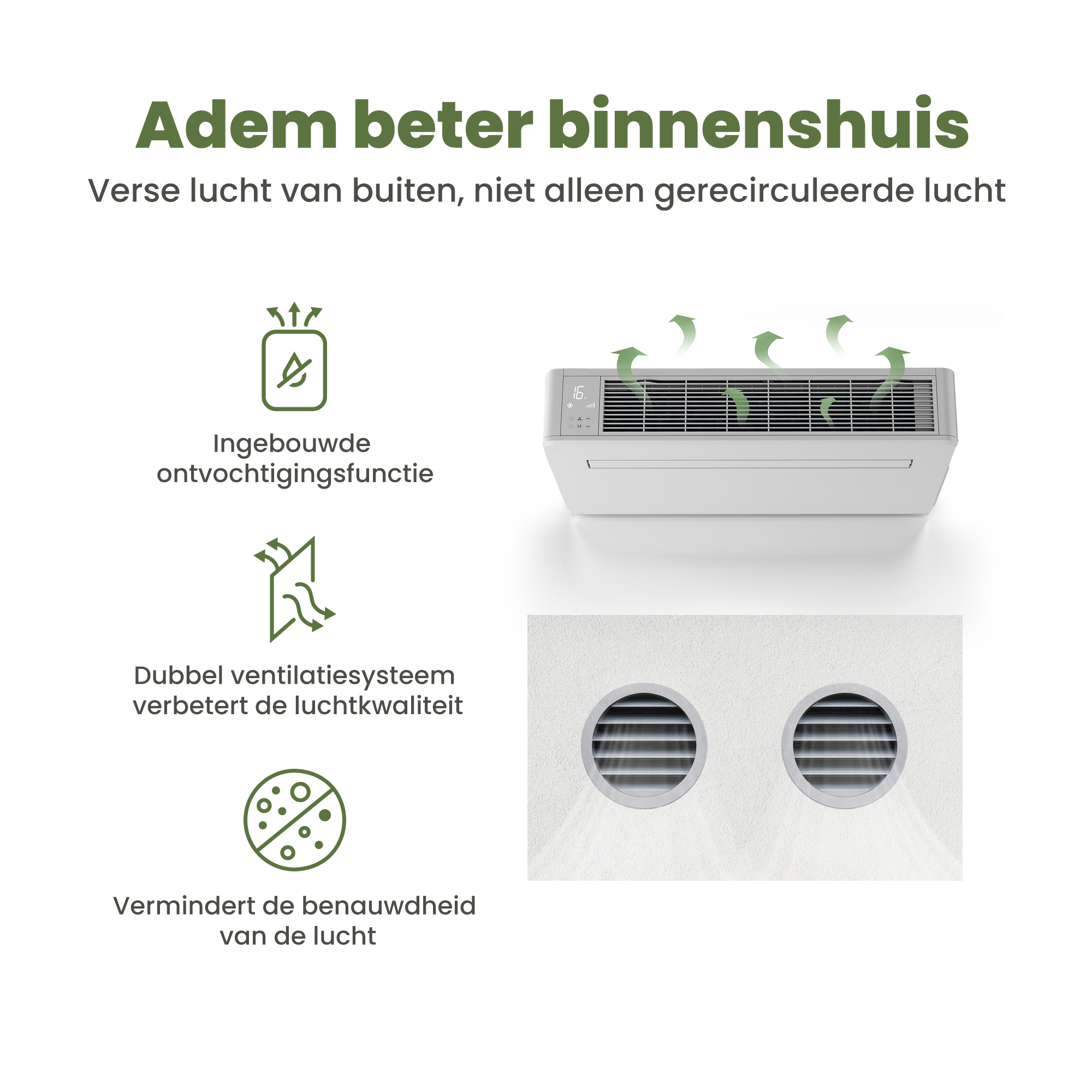 - Ventileren & ontvochtigen: zorgt voor een frisser en gezonder binnenklimaat, het hele jaar door.